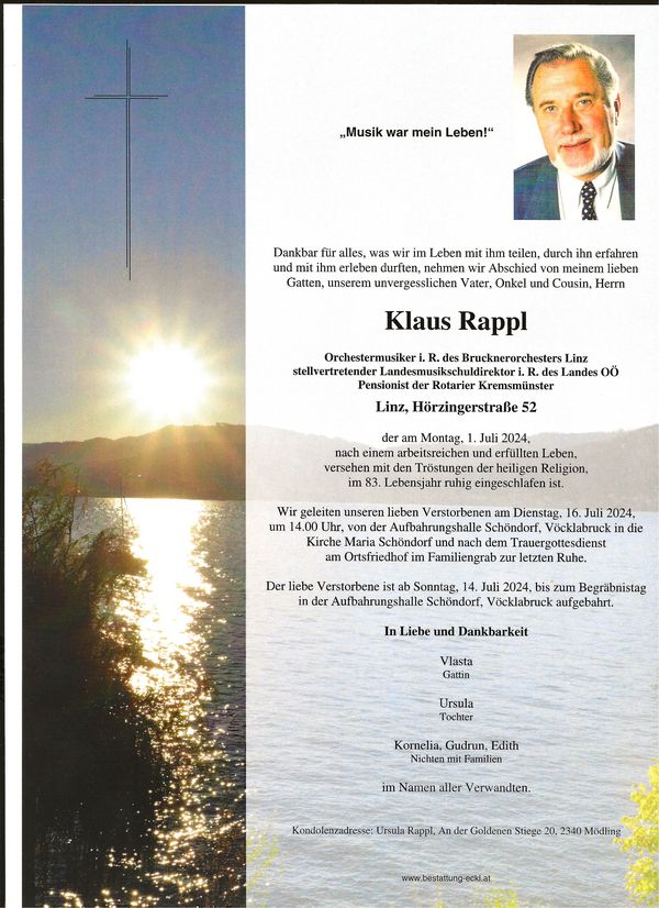 Klaus Rappl hat Spuren hinterlassen, die weit über das Musikalische hinausgehen. Er hat mit seiner Persönlichkeit und seiner Herzlichkeit viele Menschen berührt und die Welt ein Stück besser und klingender gemacht. Seine Musik und sein Geist werden in unseren Herzen weiterleben.