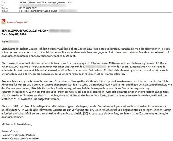 Info zu aktuellem SCAM Email - Anfrage wegen Hinterlassenschaft(Beitrag vom 09.05.2024)