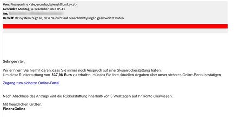 Absender bmf@bmf.gv.at (sieht sehr professionell aus) und hat den Betreff: Steuerverwaltung 0x/12/2018 - oder so ähnlich.