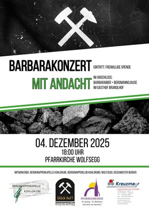 Die Bergknappenkapelle Kohlgrube, der Bergknappenclub Kohlgrube/Wolfsegg und „Geschwister Berger“ laden zum traditionellen Barbarakonzert mit Andacht am 4. Dezember 2025 um 18:00 Uhr in die Pfarrkirche Wolfsegg am Hausruck ein.